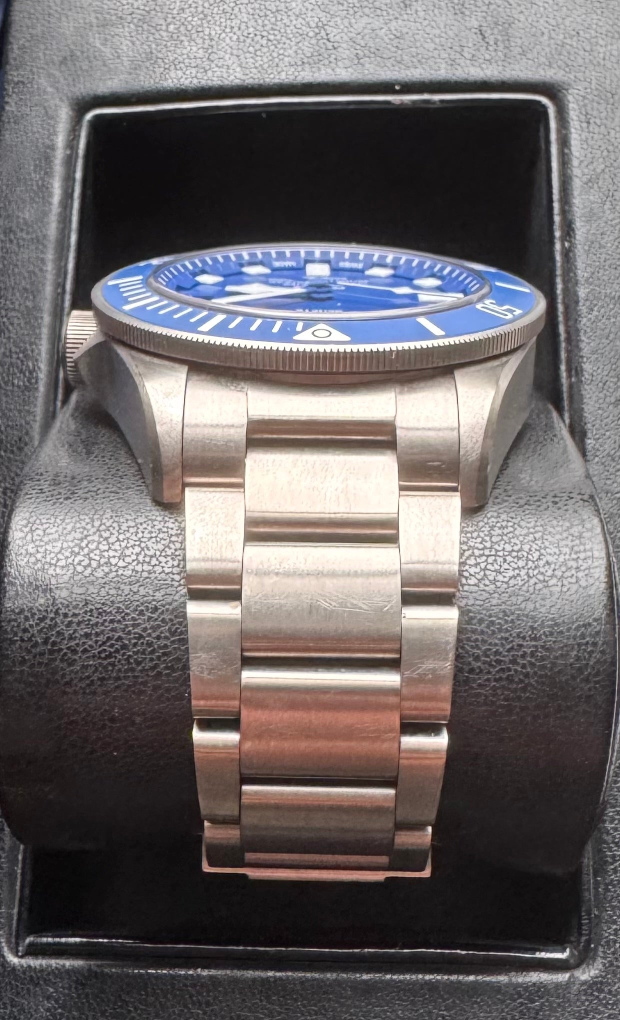 The sapphire crystal is nearly flawless, with only an extremely small mark (under 0.5 mm) that's barely visible and only noticeable under very close inspection (it’s practically invisible, on the closeup picture I circled it in a black circle). The bezel is pristine, with no marks or wear, and the case is in great shape.